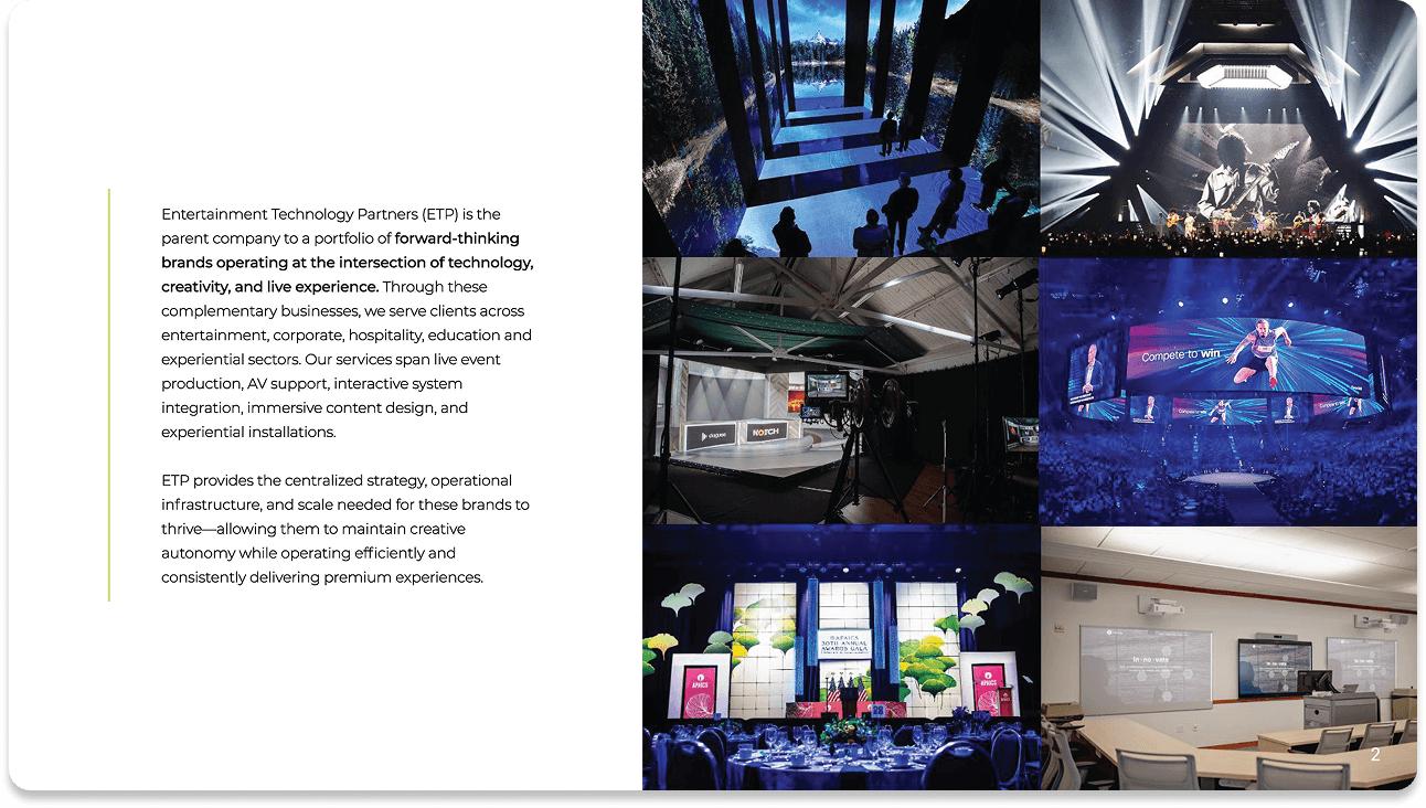 ETP is a holding company providing shared services for all it's sister brands. In its proposal to potential investors, I used a combination of imagery, iconography and infographics to best clearly explain the relationship between ETP and the brands.