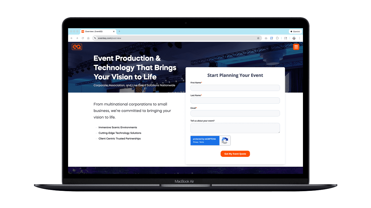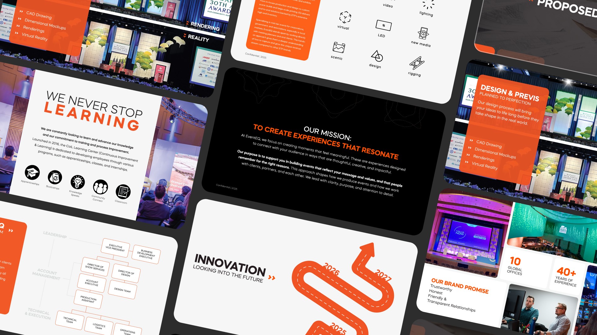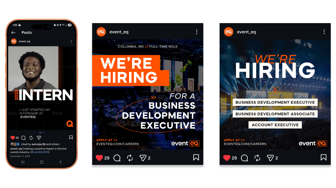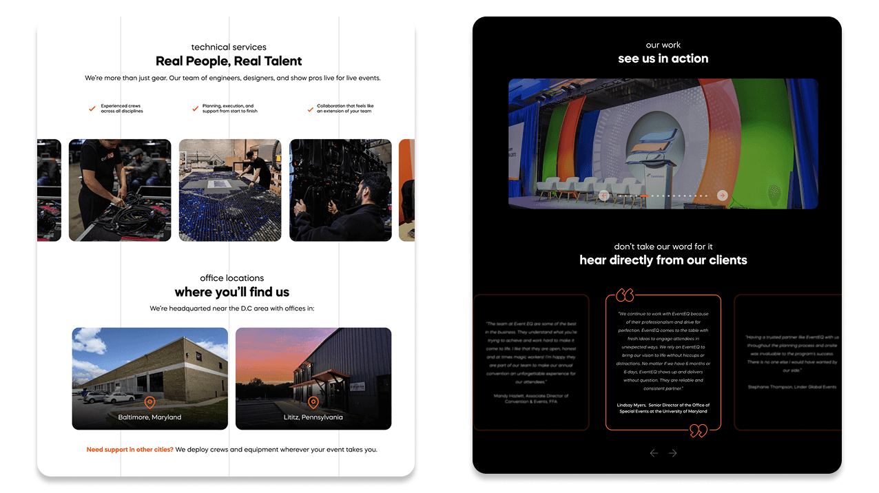To evolve the system further, I introduced new brand rules that increased the use of white space, allowing black and orange to function as accents and improving contrast while avoiding visual heaviness. Subtle grid elements were added as background textures to reference EventEQ’s scenic and design-led approach, reinforcing a key differentiator within the AV space.