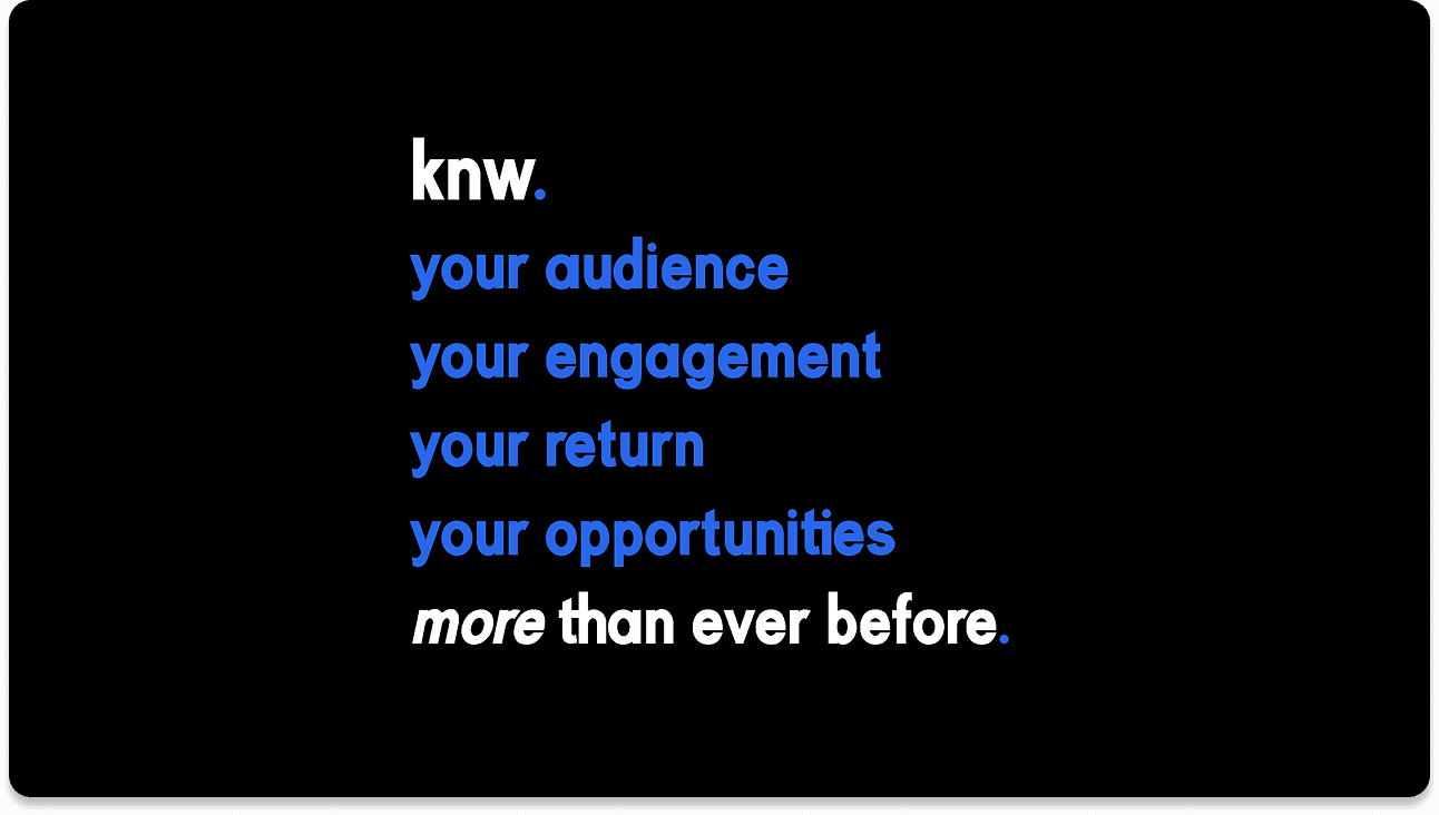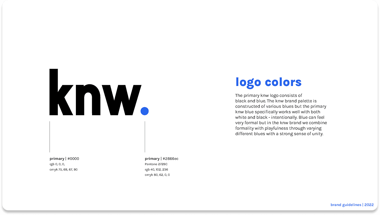 I developed the knw. brand guidelines while the platform itself was still in development, designing a flexible visual system that could grow alongside the technology. The geometric shapes and modular patterns were intentionally built to represent diverse data points, demographics, and statistics coming together into one cohesive and approachable platform. Lowercase typography and friendly type choices were selected to soften the typical tension surrounding facial recognition and data privacy, helping the brand feel more human and accessible.